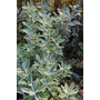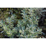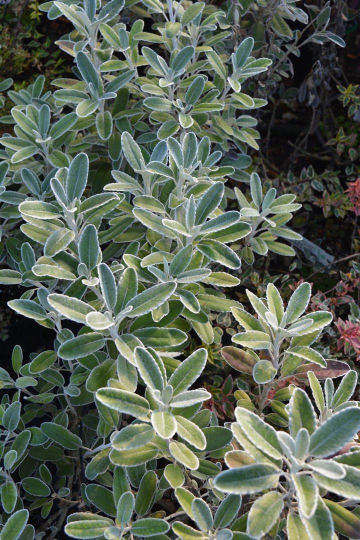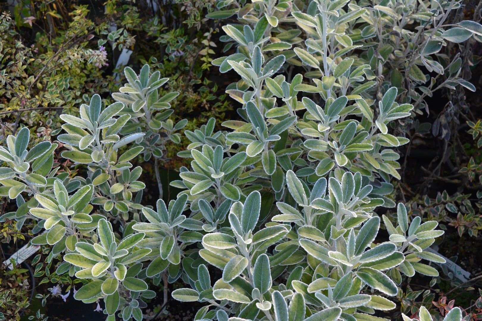 piccolo arbusto con foglie ovali bianco-grigio, fiori a margherita