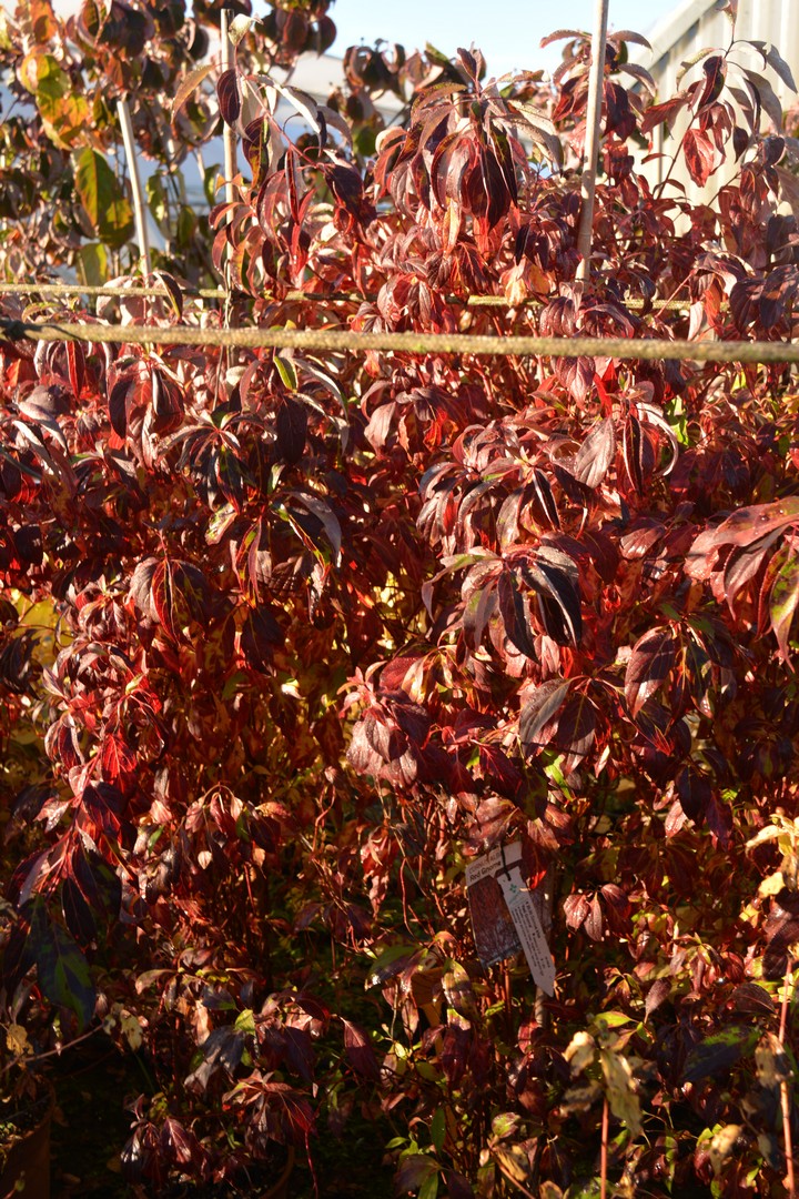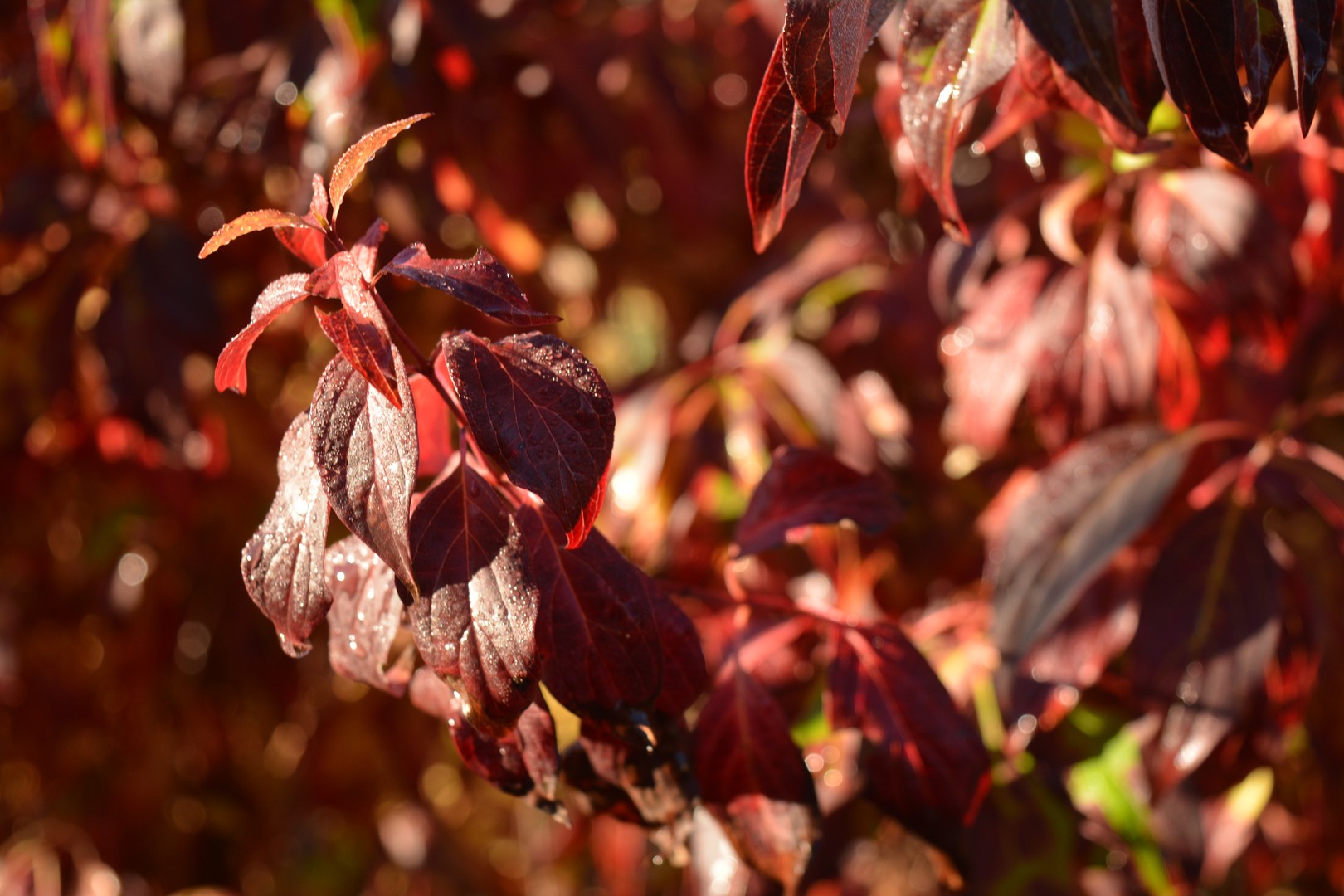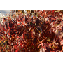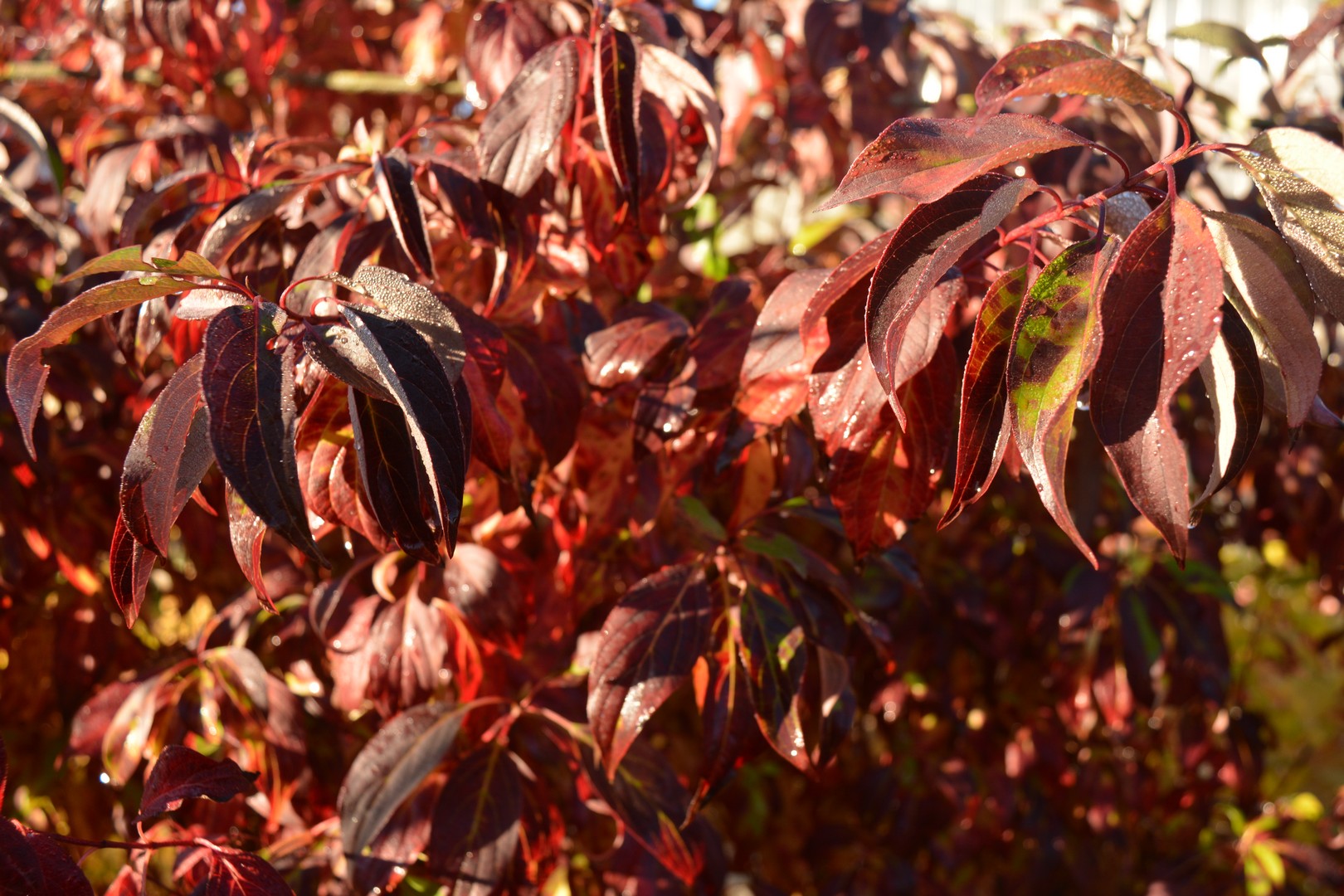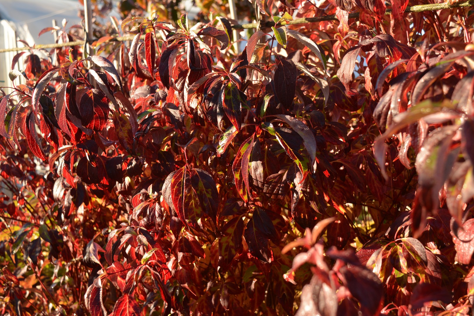 arbusto con rami rossi, foglie verde scuro che diventano porpora in autunno, bacche bianche