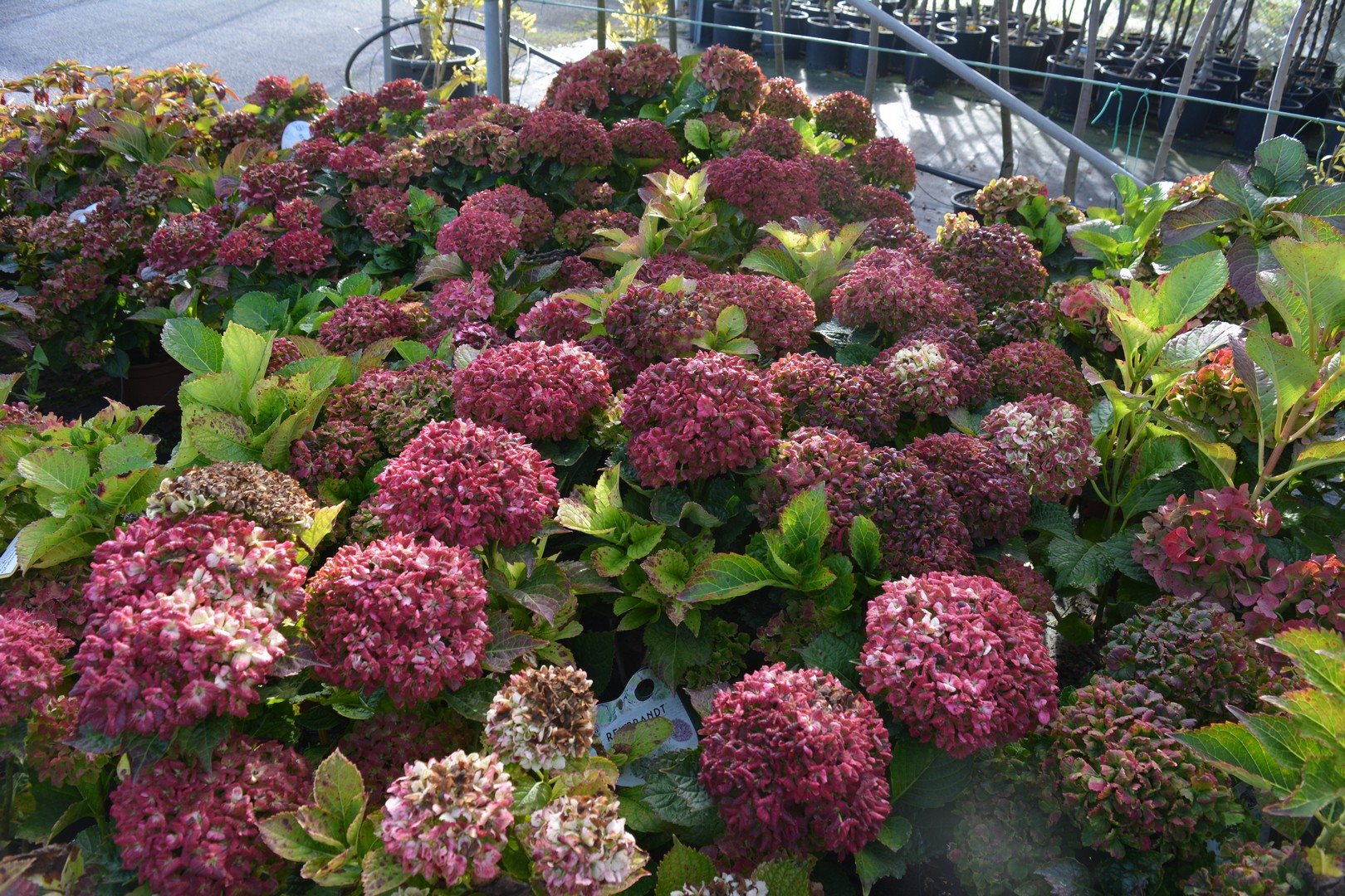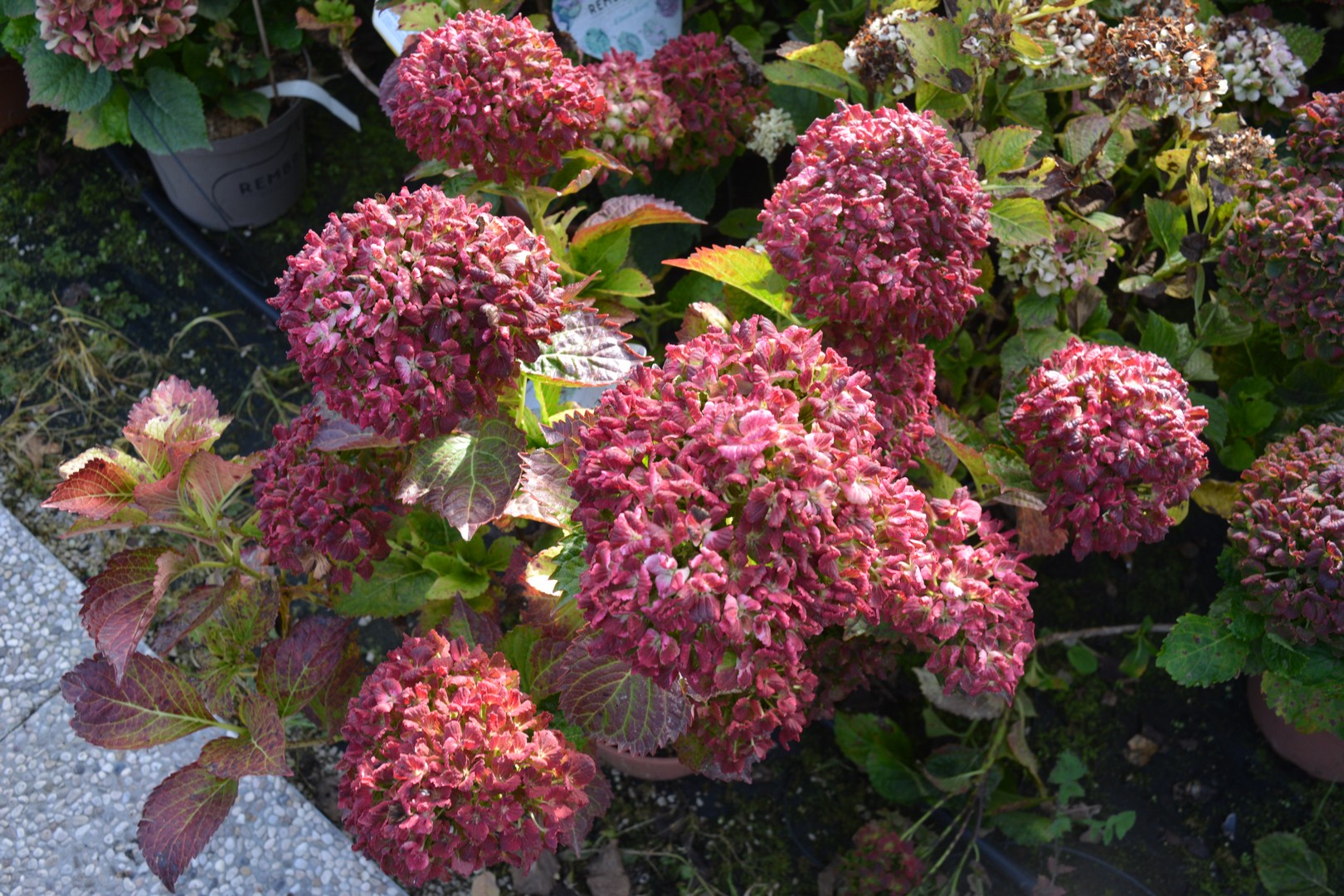 pianta compatta, infiorescenze a palla verdi che cambiano colore arrossendo con l'età