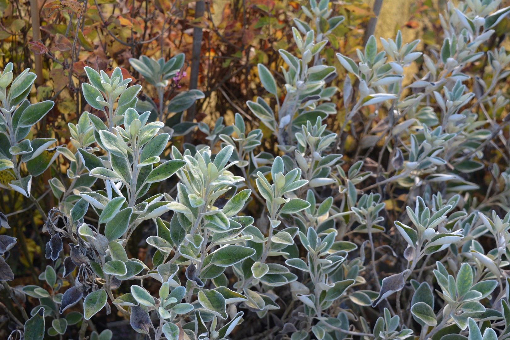 piccolo arbusto con foglie ovali bianco-grigio, fiori a margherita