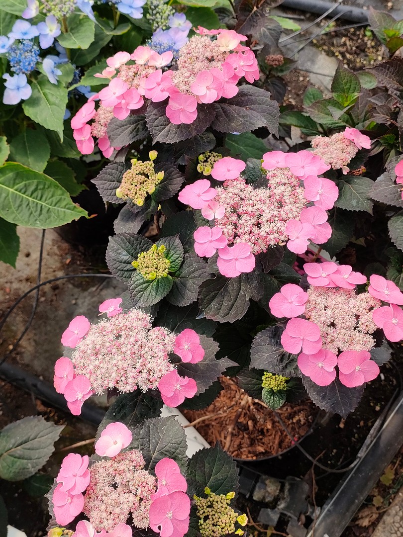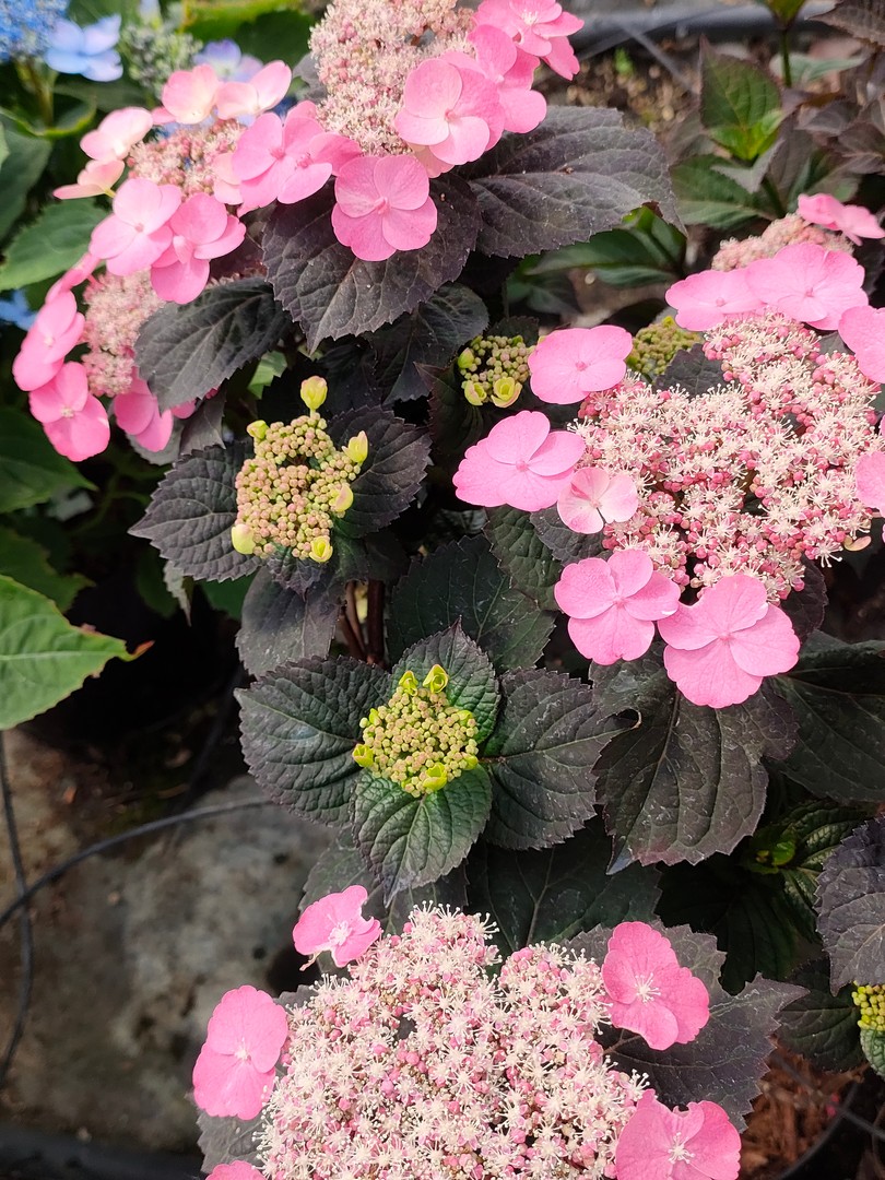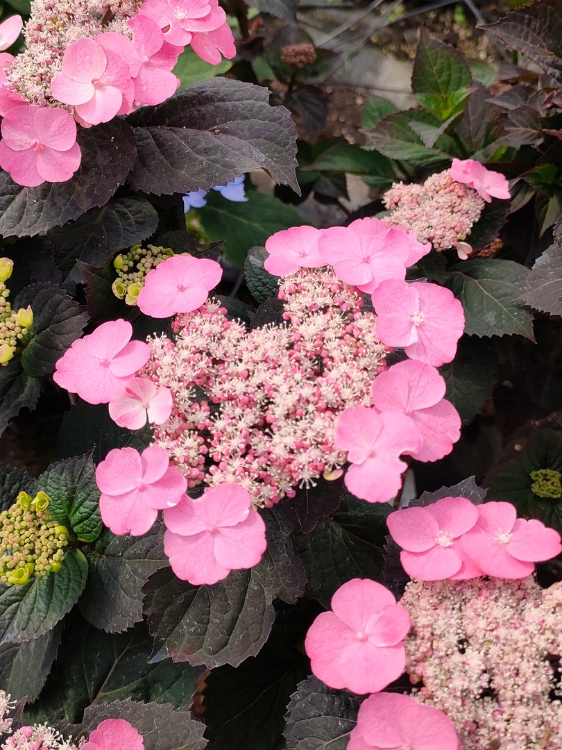 Fogliame molto interessante: verde-bronzeo in primavera, da bruno scuro a quasi viola-nero durante l’estate, per finire con tocchi di rosso porpora intenso in autunno-inverno. Già solo per il colpo di colore creato dalle foglie questa ortensia attirerebbe l’attenzione in qualunque punto del giardino la si collocasse (evitando le posizioni in sole pieno nel pomeriggio). Oltretutto rifiorisce abbondantemente per tutta l’estate, anche sui getti dell’anno. Le infiorescenze appiattite hanno toni rosa intenso in terreno neutro o viola in terreno acido. In autunno virano a rosso scuro e mantengono il colore a lungo durante l’inverno anche se raccolte come fiori da essiccare. Il cespuglio ha un bel portamento folto e allargato (indicativamente 70cm per 1m).