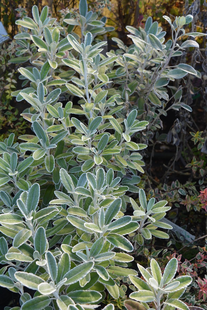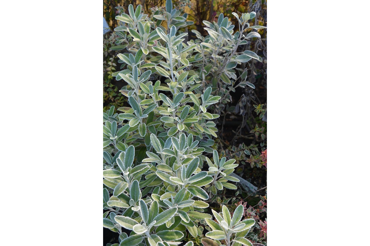 piccolo arbusto con foglie ovali bianco-grigio, fiori a margherita