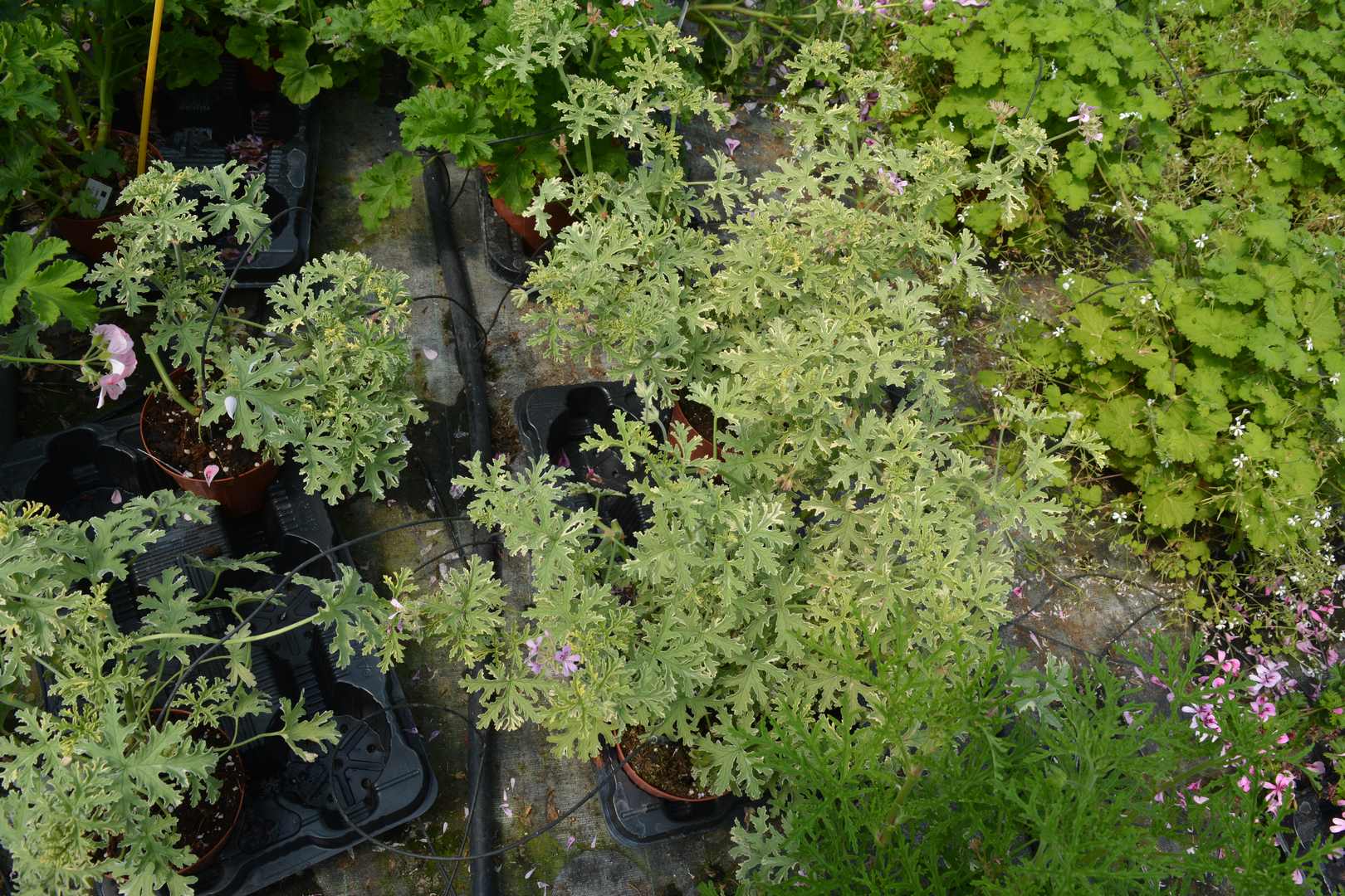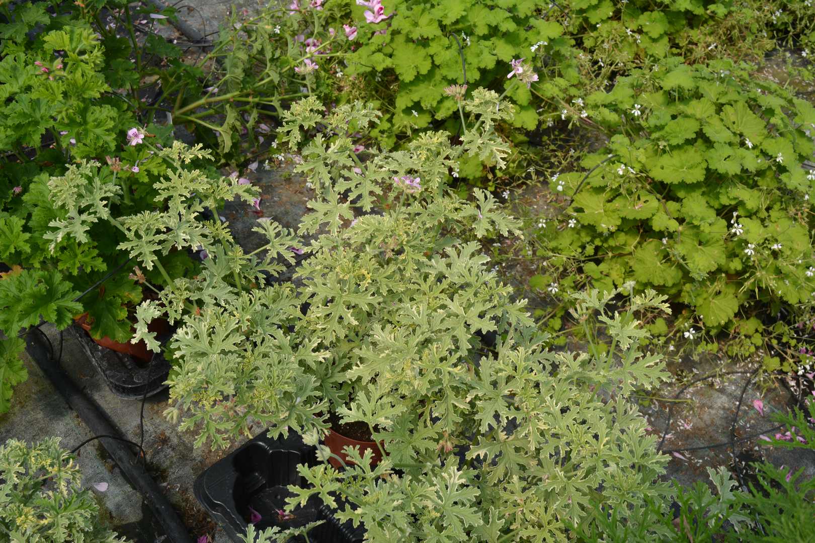 Pelargonium odoroso; profumo di limone, fiore rosa pallido, foglia grigio-verde con bordo crema