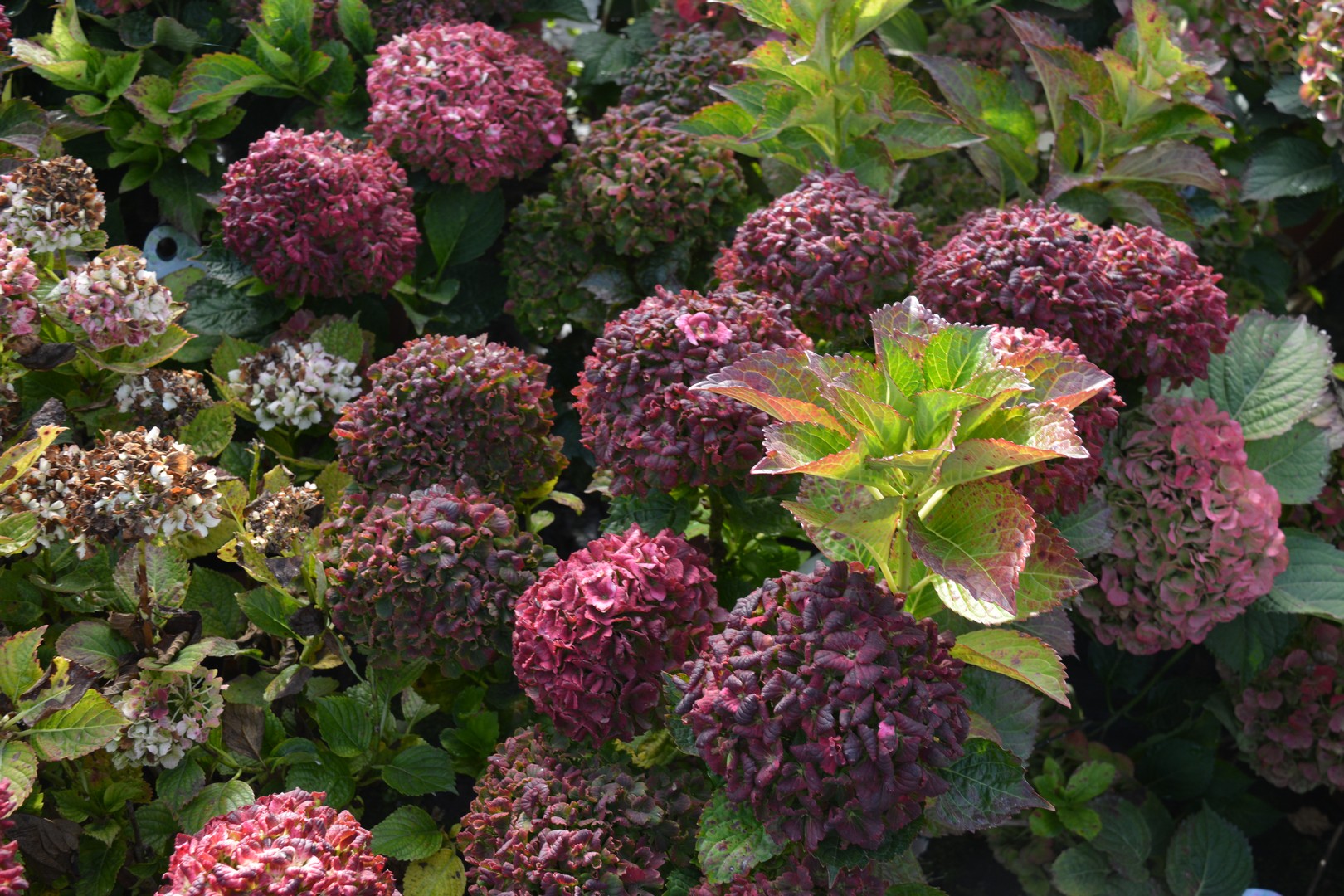 pianta compatta, infiorescenze a palla verdi che cambiano colore arrossendo con l'età