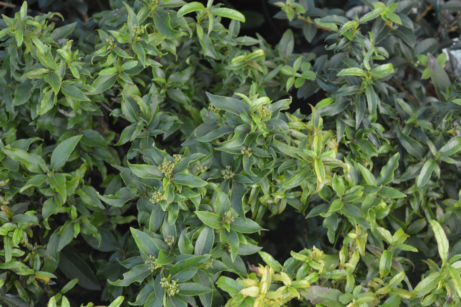 pianta nana, folta e compatta, fogliame verde scuro più stretto di V.tinus
