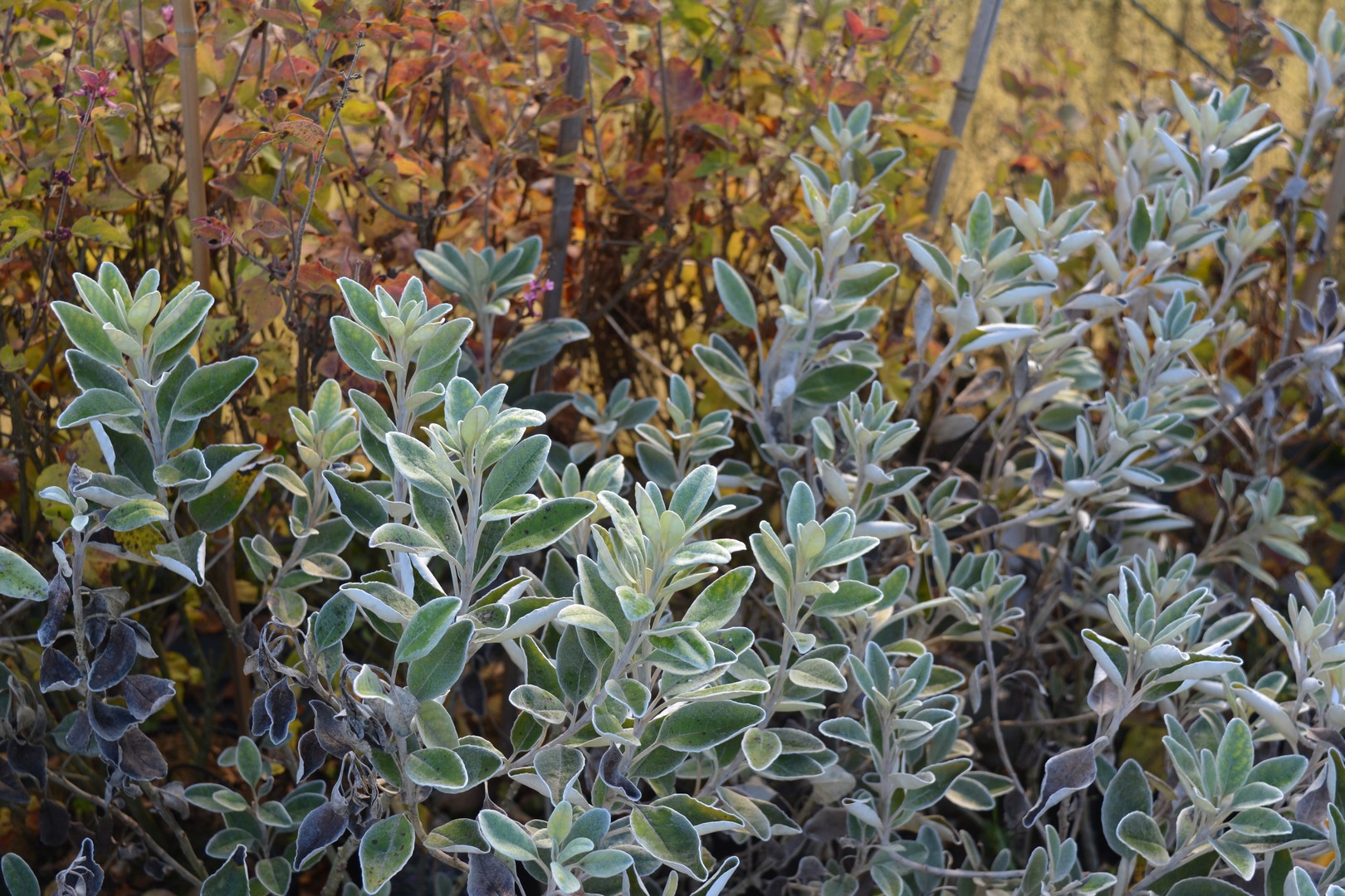 piccolo arbusto con foglie ovali bianco-grigio, fiori a margherita