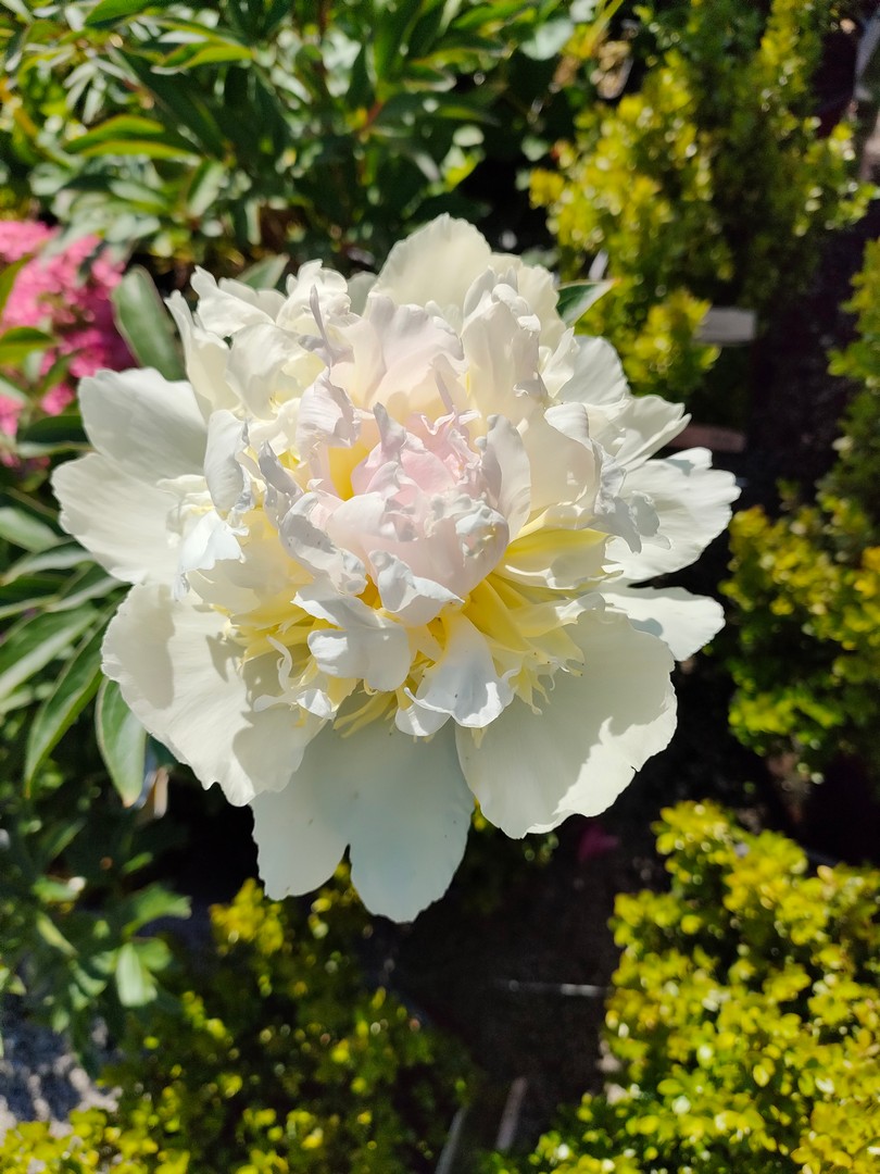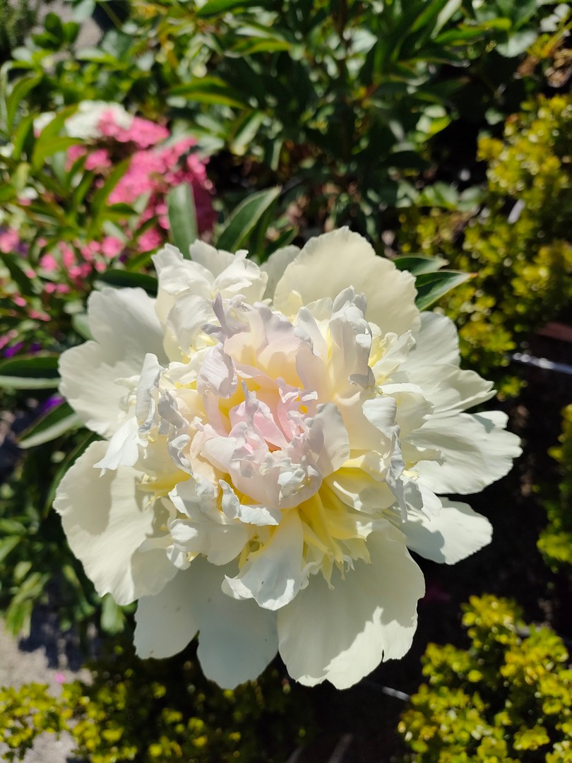 fiore grande doppio arrotondato, colore sfumato con toni di bianco giallo e rosa